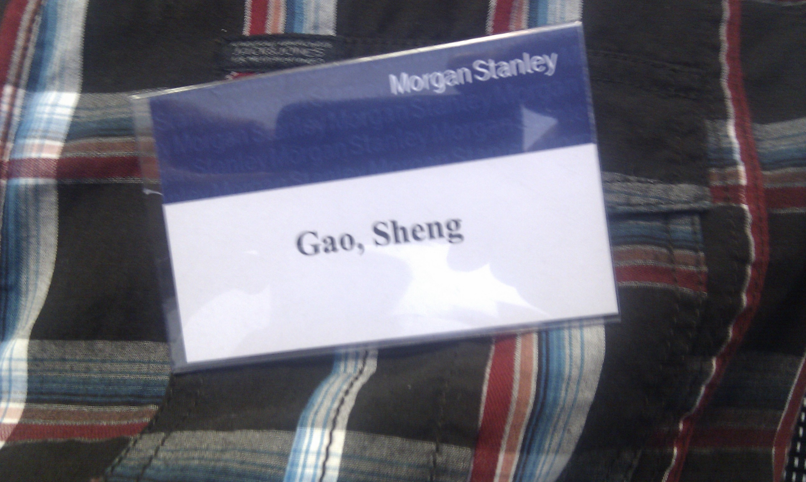 说件轶事吧,因为没有注意邮件中说要要穿正装,我就穿着便装来到了大摩,看到大家都穿着正装,我有点惊异的看着大家,大家也有点惊异的看着我,不过气氛还算融洽。自我介绍的时候,我说我叫gaosheng,大家都笑了,HR姐姐还拿我开玩笑,说,高盛居然到大摩来面试来了。
