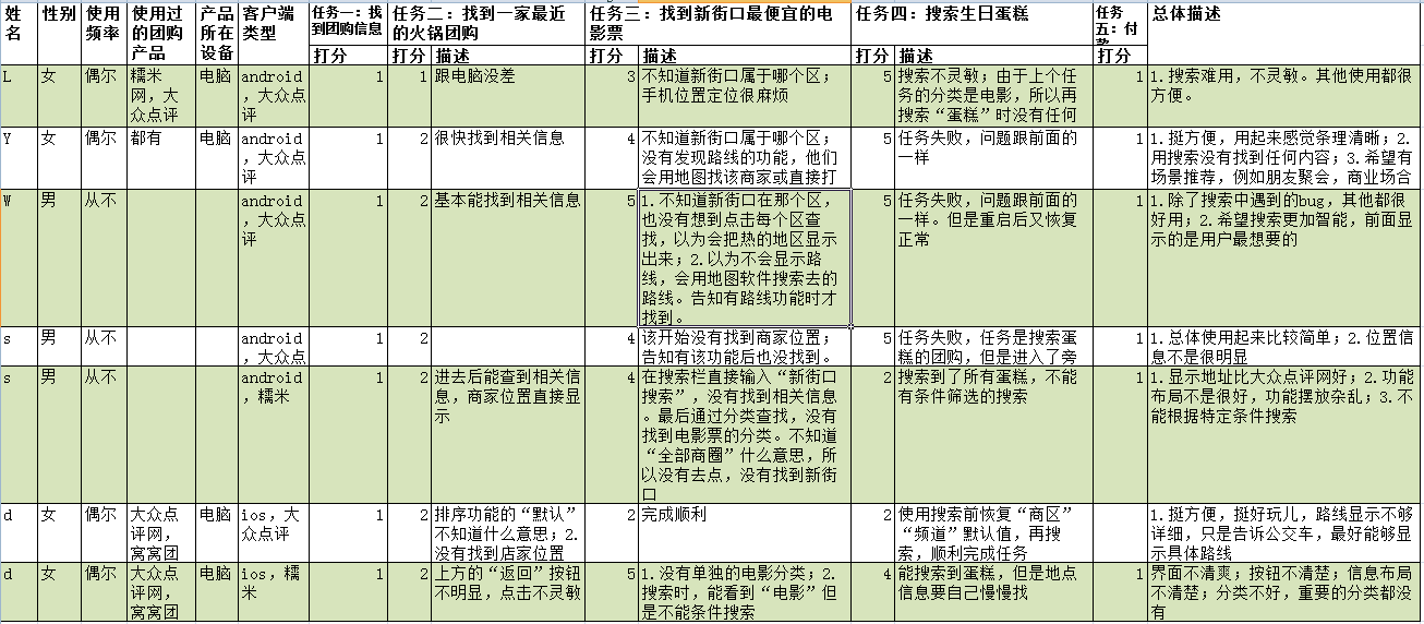 这组实验主要检查大众点评客户端的可用性,其次对比糯米客户端,比较优缺点。由于这些软件的功能相对简单,学习成本很低,使用过一次后,都能记住怎么使用,所以选择的都是没有使用过这些软件的新手用户,找到第一次使用的问题。另外,选择了用户会使用到的典型功能(实际情况下不能真正付款,所以只是做到下订单的一步),另外图片都是android手机上的。
